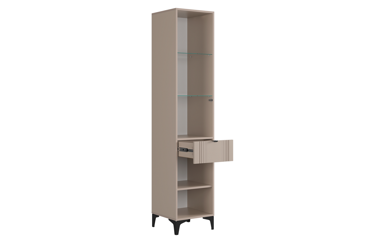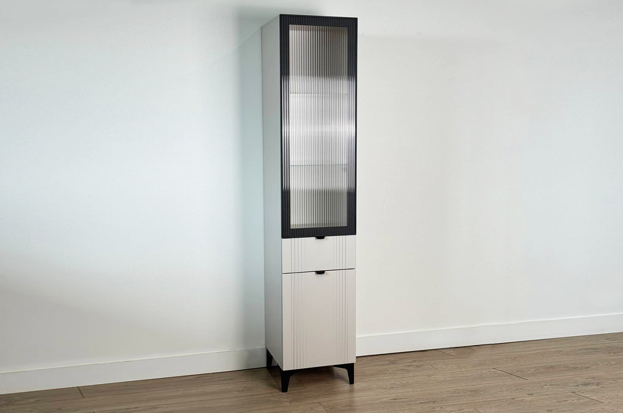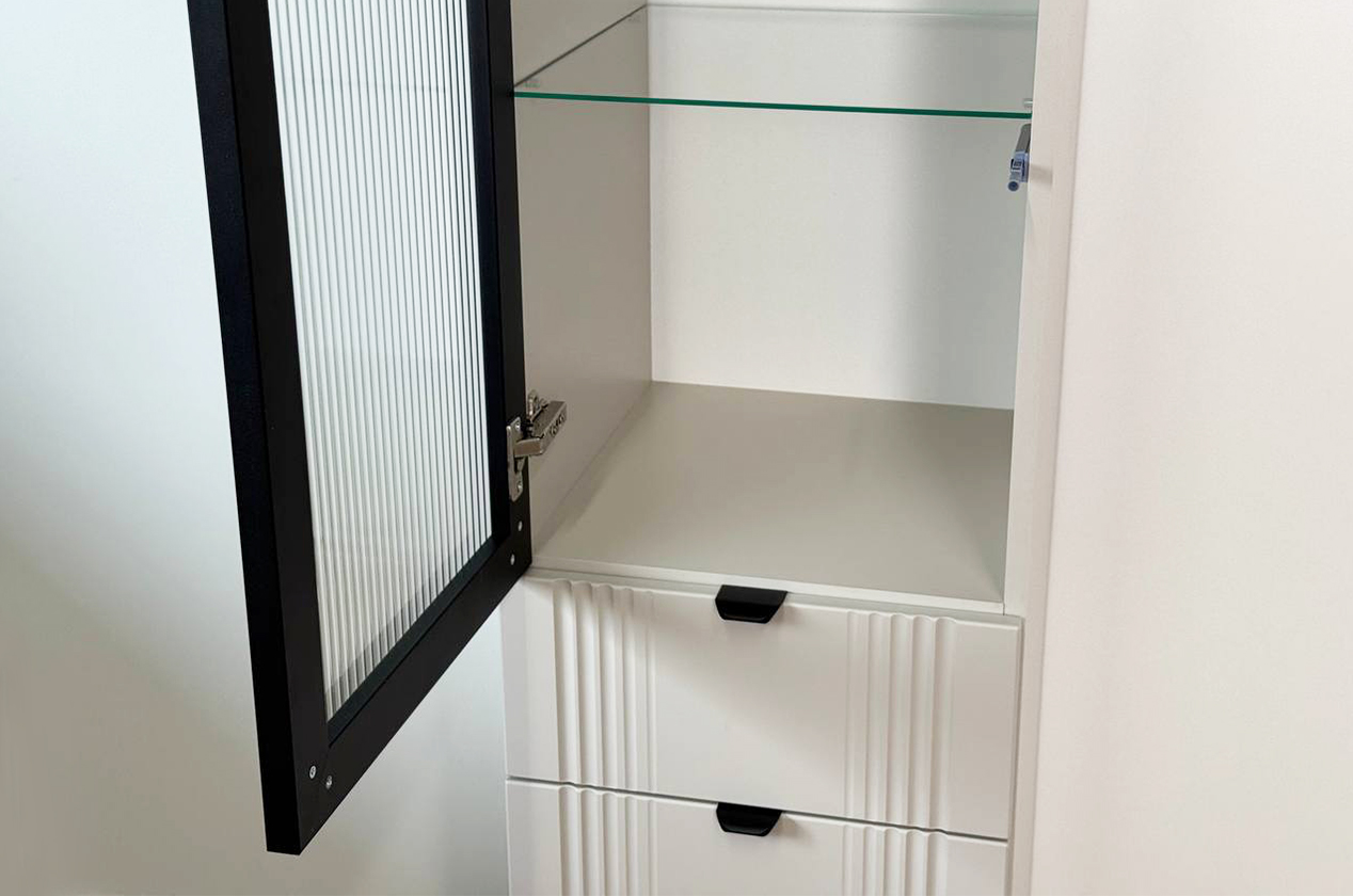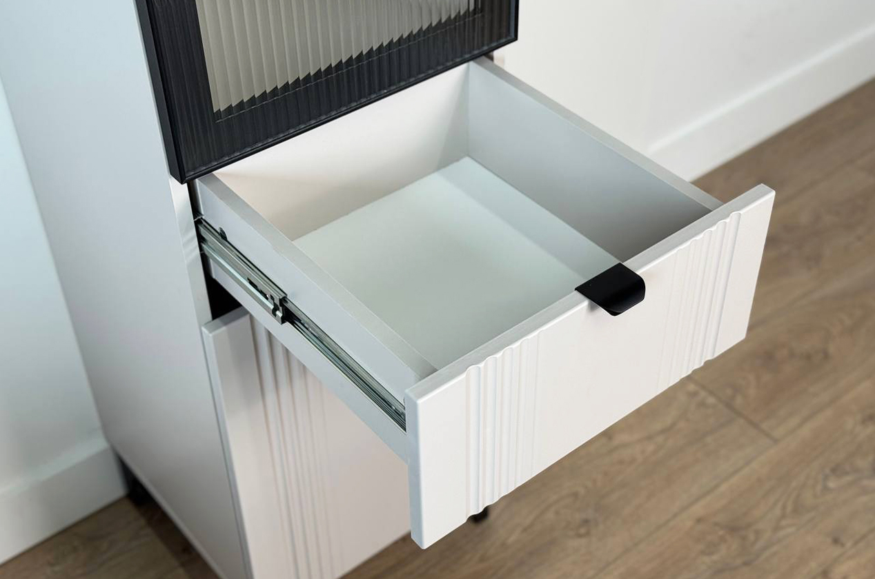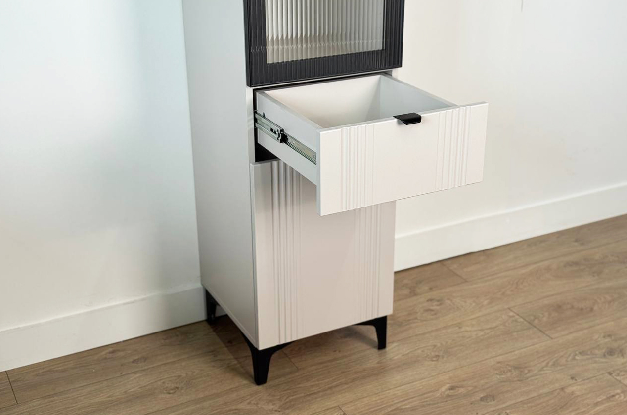 • Внутреннее наполнение: Полки за стеклянной и глухой дверцами, а также выкатной ящик для эффективного использования пространства.