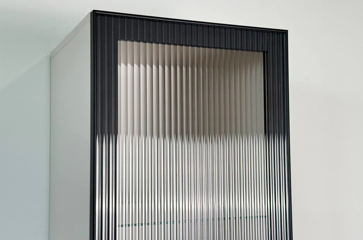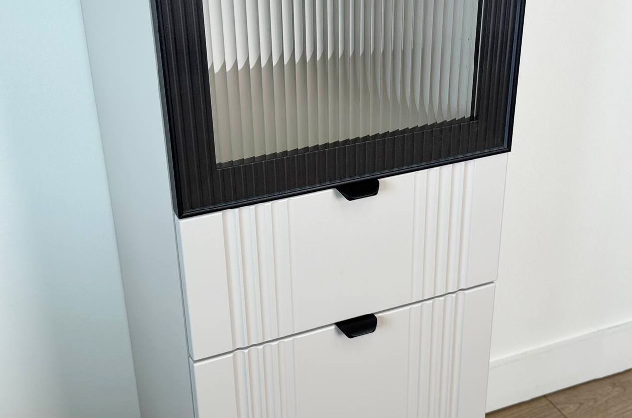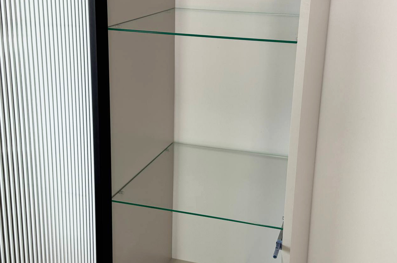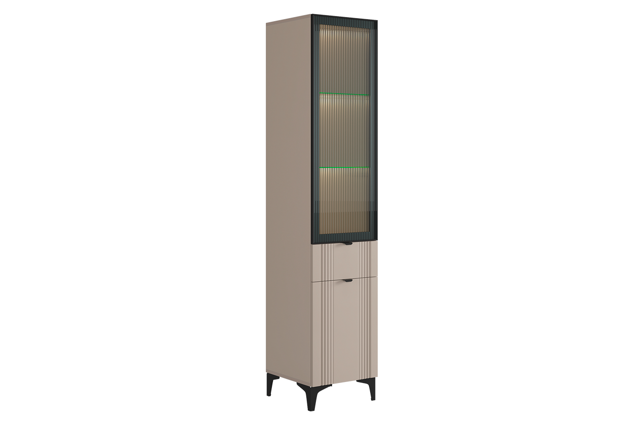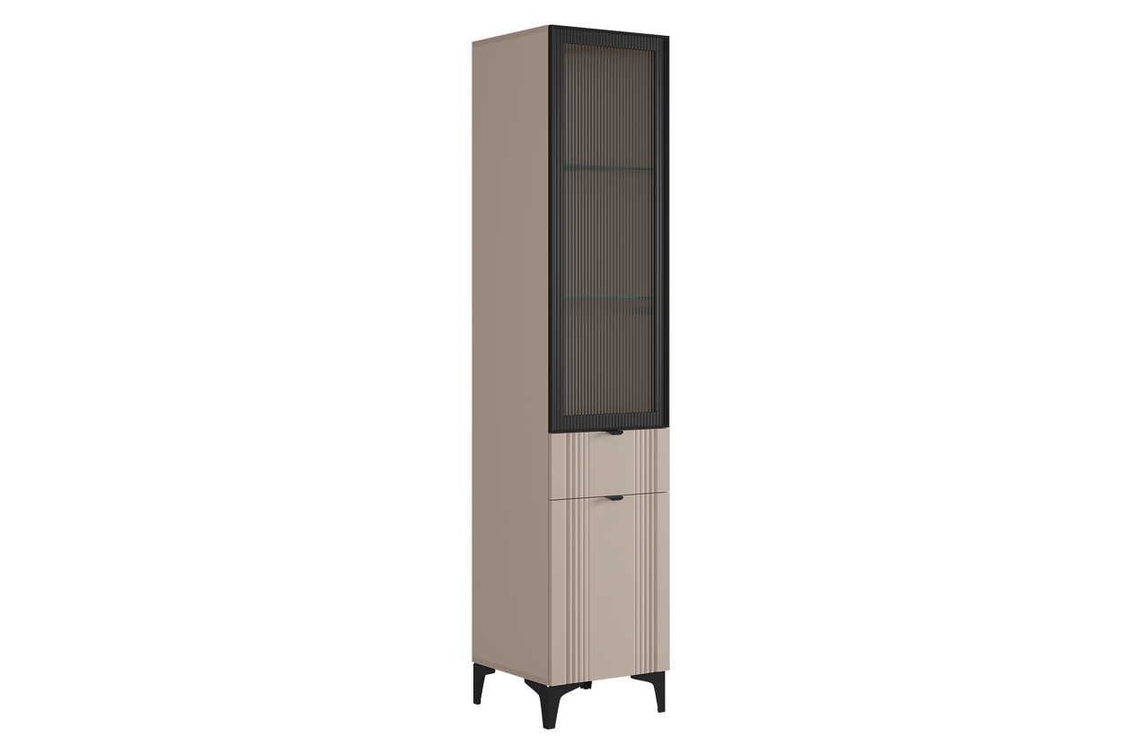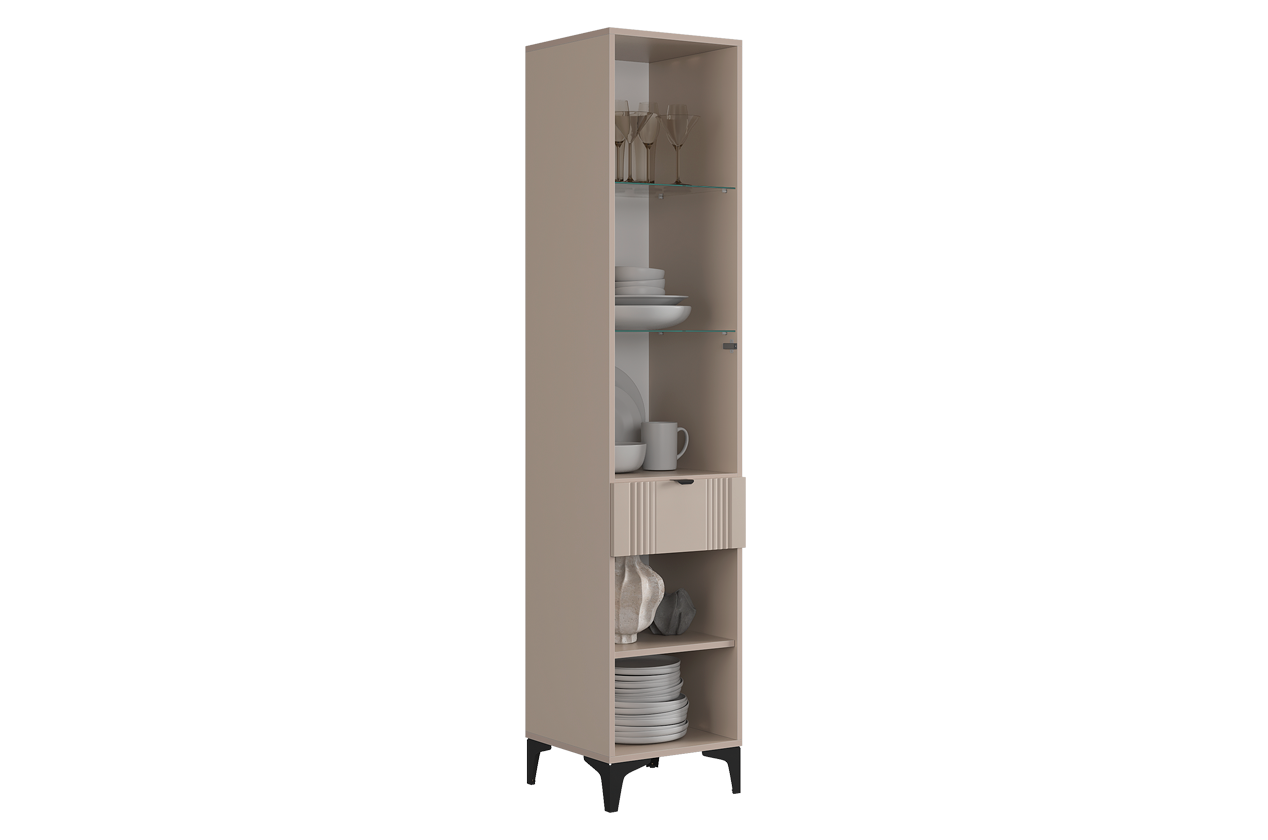 • Внутреннее наполнение: Полки за стеклянной и глухой дверцами, а также выкатной ящик для эффективного использования пространства.