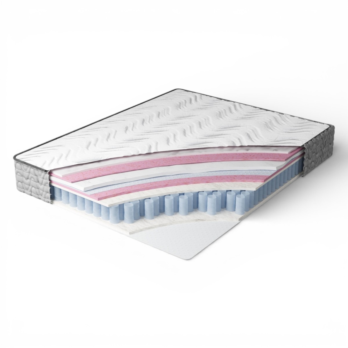 1. Независимый пружинный блок: Каждая пружина работает автономно, точечно подстраиваясь под вес и изгибы вашего тела. Это гарантирует безупречную ортопедическую поддержку, отсутствие эффекта «гамака» и абсолютную бесшумность. Блок обеспечивает идеальную циркуляцию воздуха, поддерживая оптимальный микроклимат для сна.