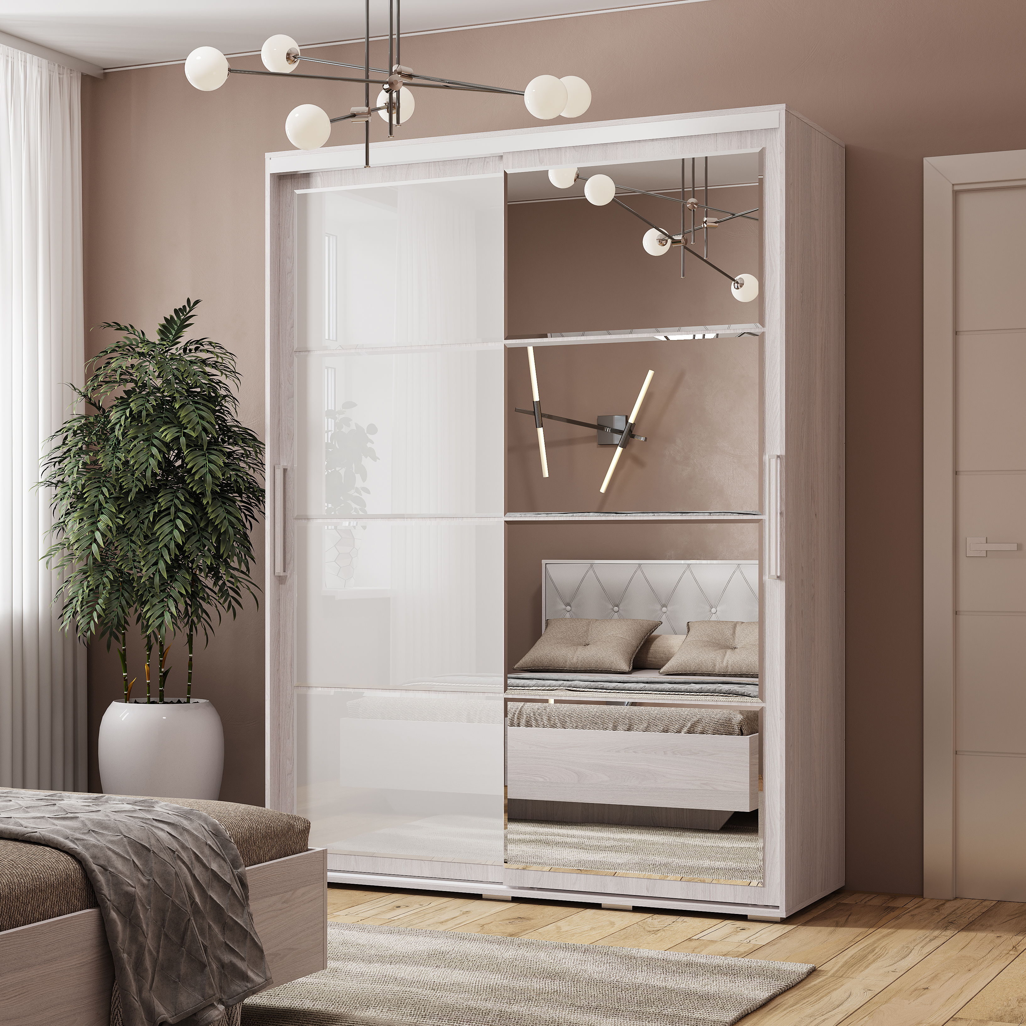 •  Грамотное наполнение: Внутри предусмотрено всё необходимое — плательный отсек с хромированной штангой (772 мм), два выдвижных ящика, антресоль и вместительные полки.