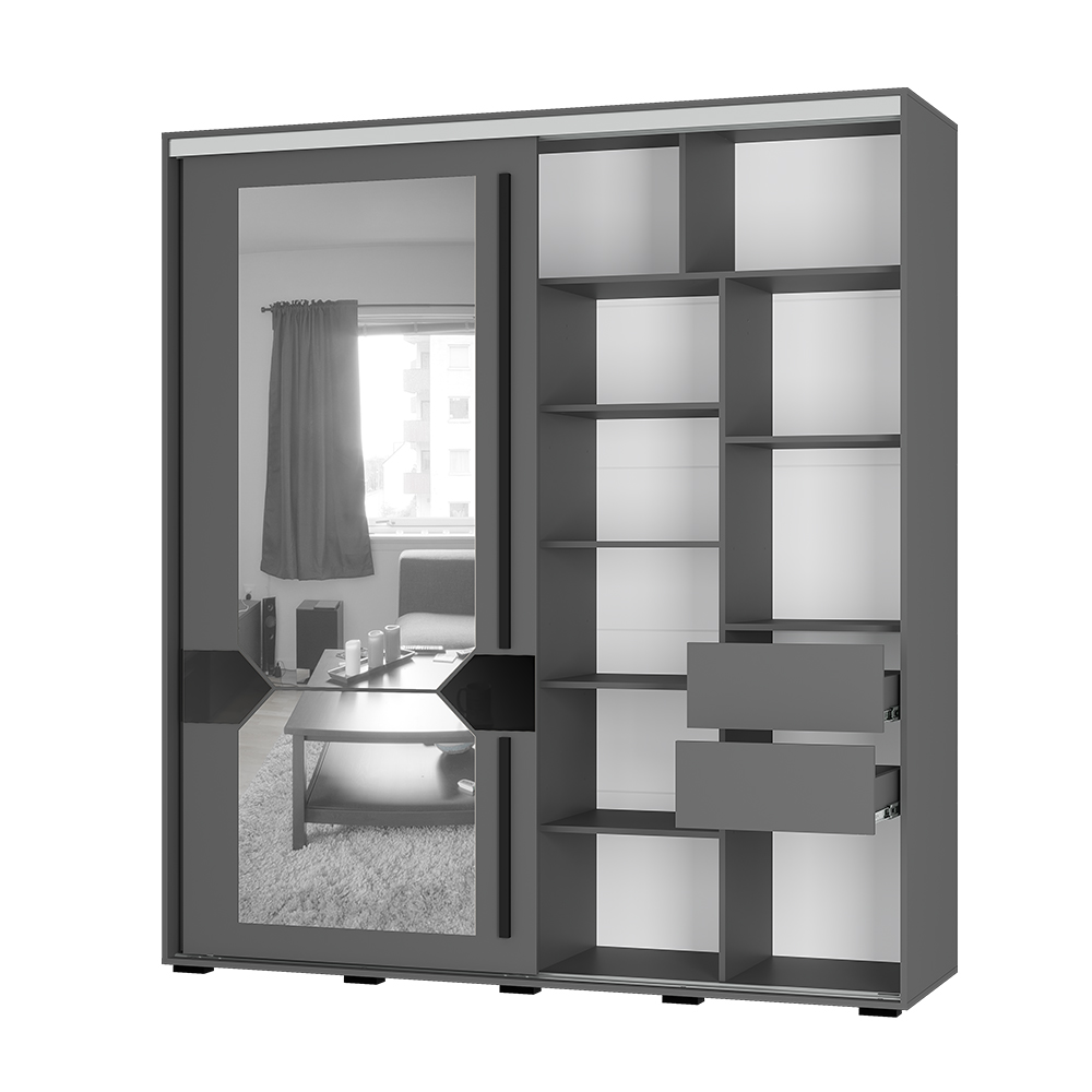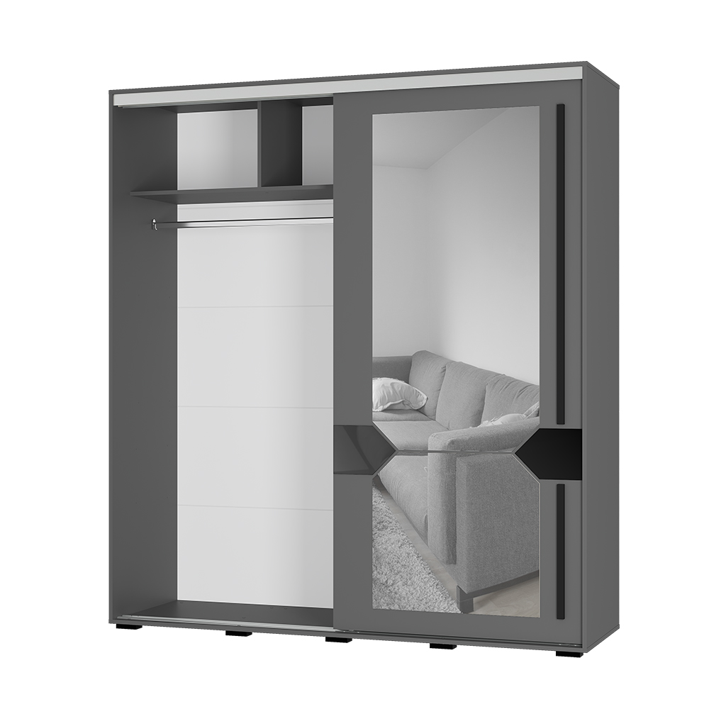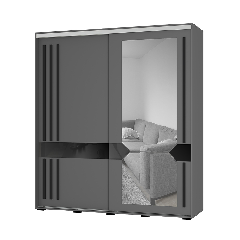 · Дизайн: Благородный цвет «графит», геометрическое зеркало с еврокромкой, черный лакобель, длинные МДФ-ручки (1175 мм и 495 мм).