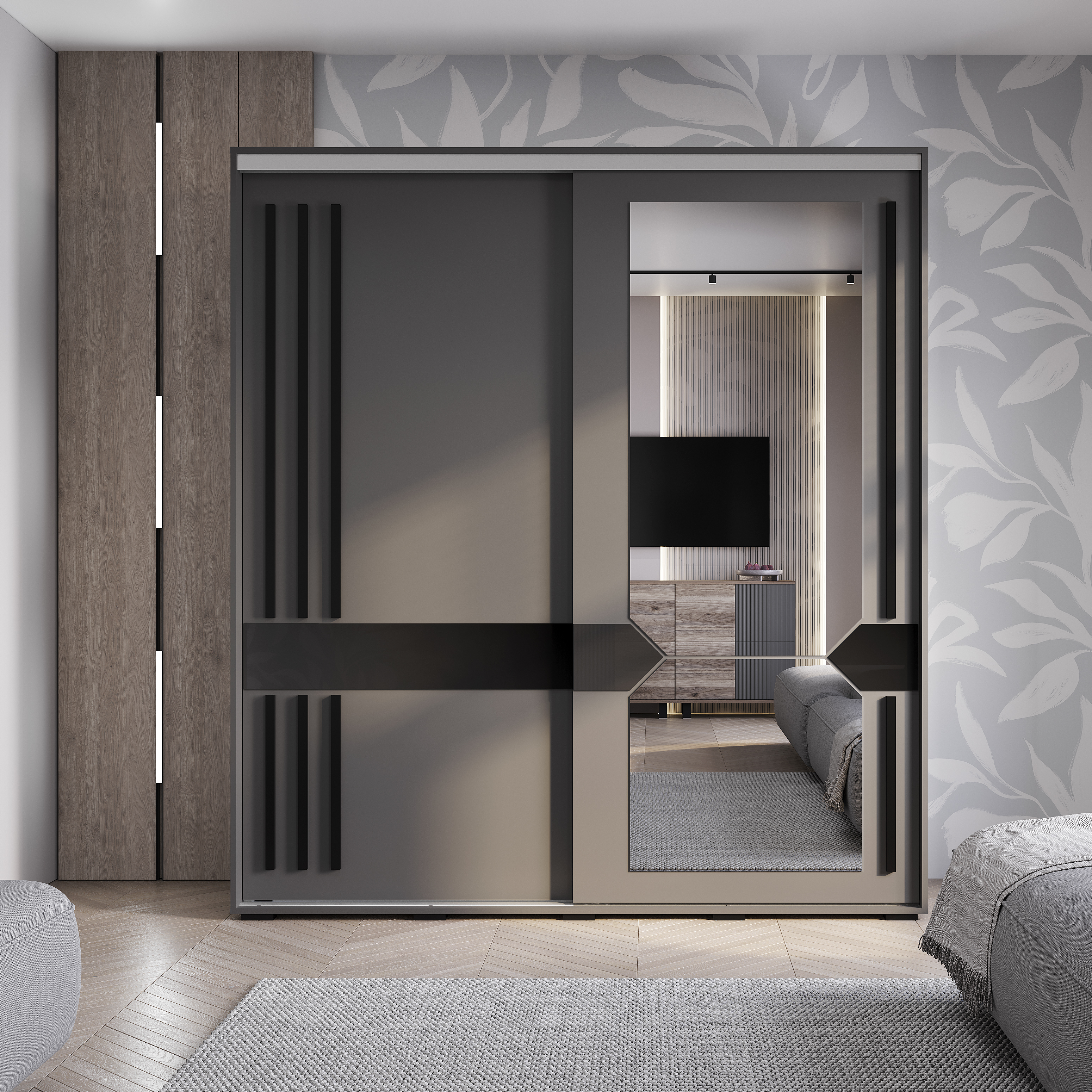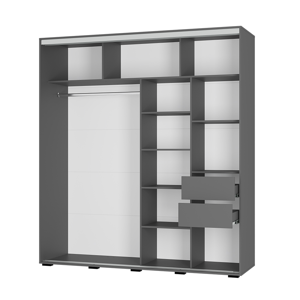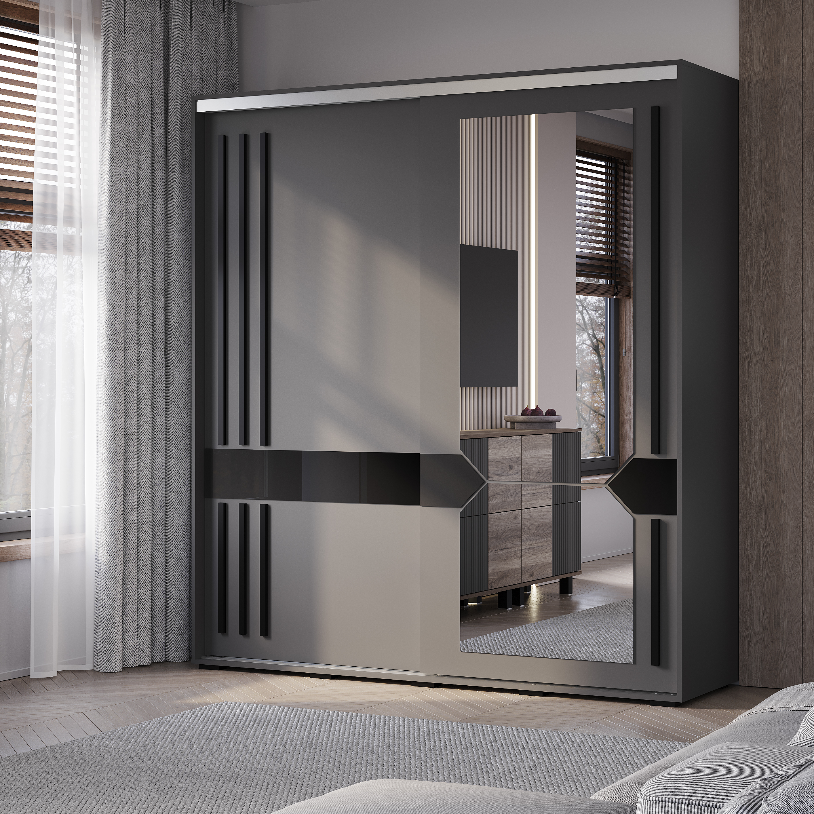 · Дизайн: Благородный цвет «графит», геометрическое зеркало с еврокромкой, черный лакобель, длинные МДФ-ручки (1175 мм и 495 мм).